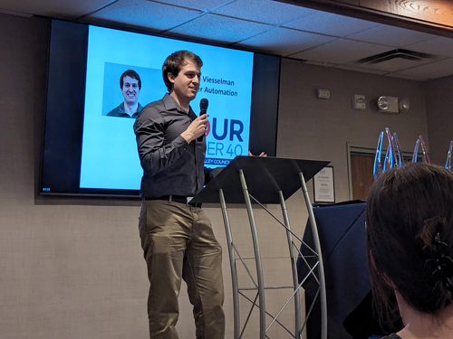 "In Sam I've seen a tendency towards leadership, a tendency towards innovative ideas," said Software Engineering Supervisor Logan Kahler in introducing Viesselman. "And not just the ideas but also putting in the time and setting the goals necessary to make them a reality."